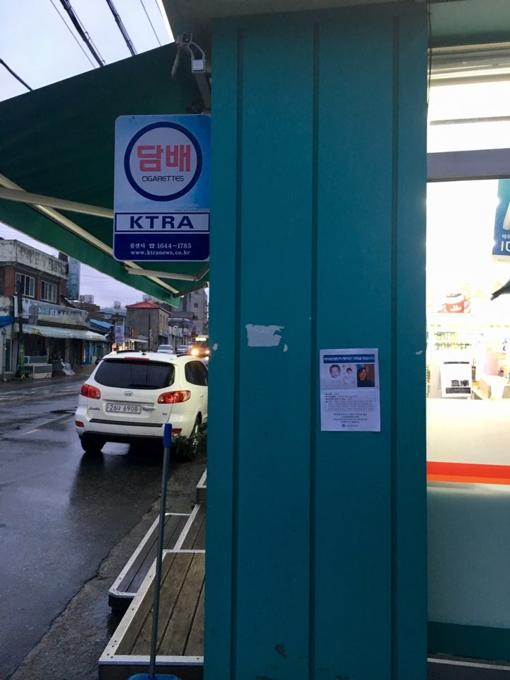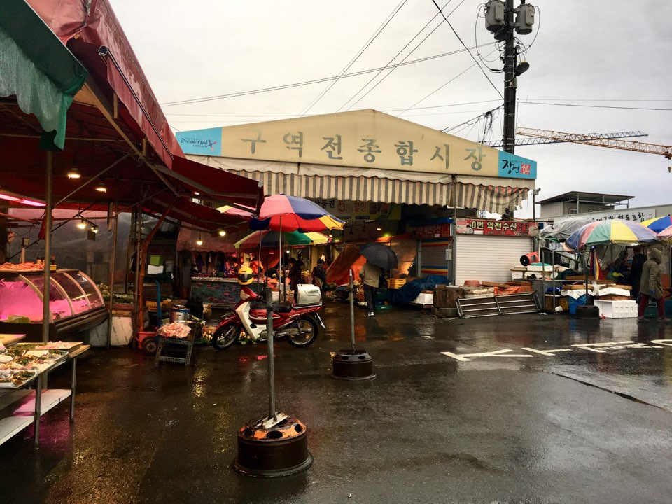 I took a bus to Seoul Station, then to Yongsan Station where I took a KTX bullet train 2 hours south to Gunsan. Overwhelmed and disoriented I remember thinking that if I made one mistake of going the wrong way that I might not make it that evening to my destination. On the KTX train there was a man taking up tickets and he could tell I was wasn’t exactly sure how to get where I was going. He was able to help me figure out how to get on the right bus to my hotel and gave me directions. Arriving in Gunsan I found the bus station, bought a ticket and was on my way for about another hour. Finally I arrived at my hotel about 10:30pm. I was emotionally drained and exhausted but it was important for me to walk around and just be in that space in that moment. That area of the city was all closed except for a few convenience stores so I grabbed a beer and walked around by myself taking it all in. I had to leave the next day and catch a flight back to the U.S. so my time was limited in Gunsan and it was critical that I wake up in time to hang my flyers. I set my alarm for 6am and woke up to pouring down rain. I started crying because I had come all that way and it was so important for me to hang my flyers and see that damn seafood restaurant.
